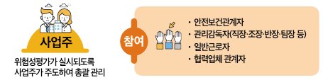 위험성 평가에는 작업에 대해 가장 잘 아는 근로자가 참여해야 하며 위험성 평가를 실시 할 때 근로자가 참여를 하고 근로자의 위험성 감소 방안 의견을 참여하도록 한다.