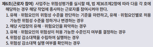 - 사업주는 제1항에 따른 평가 시 고용노동부장관이 정하여 고시하는 바에 따라 해당 작업장의 근로자를 참여시켜야 한다.